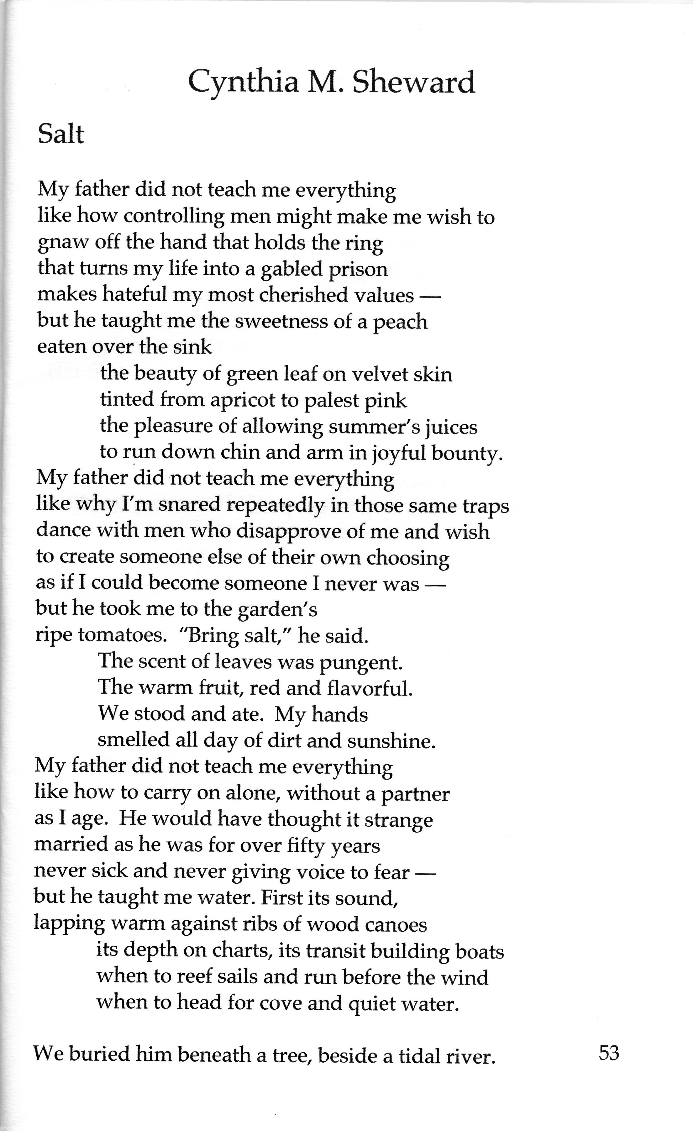 “Salt.” Poets of the Palm Beaches Anthology. 2014. https://cynthiamsheward.com/wp-content/uploads/2019/03/img_0002-e1553432974307.jpg