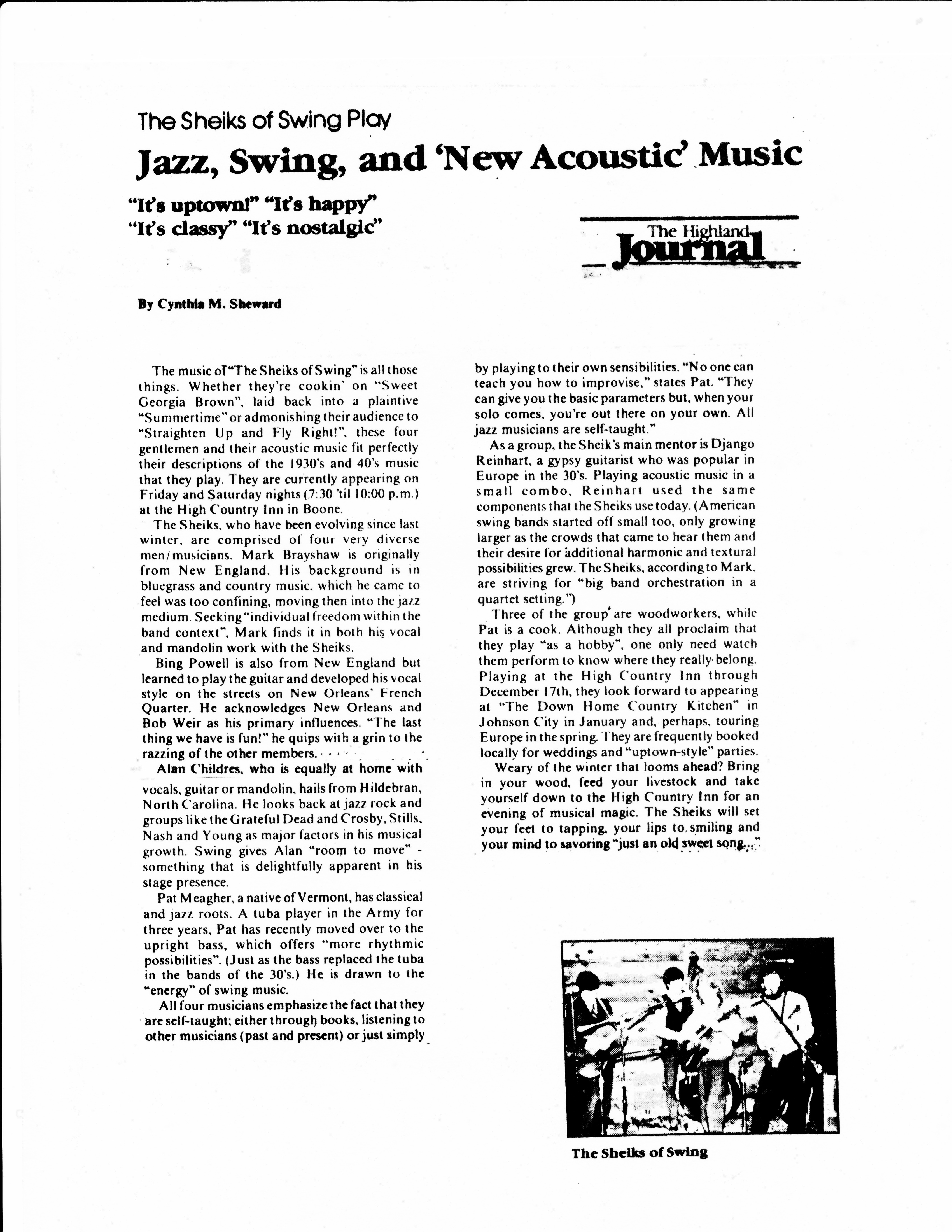 “The Sheiks of Swings Play Jazz, Swing and “New Acoustic” Music.”The Highland Journal. Boone, NC. December 12, 1984. https://cynthiamsheward.com/wp-content/uploads/2019/03/img_0004-1.jpg