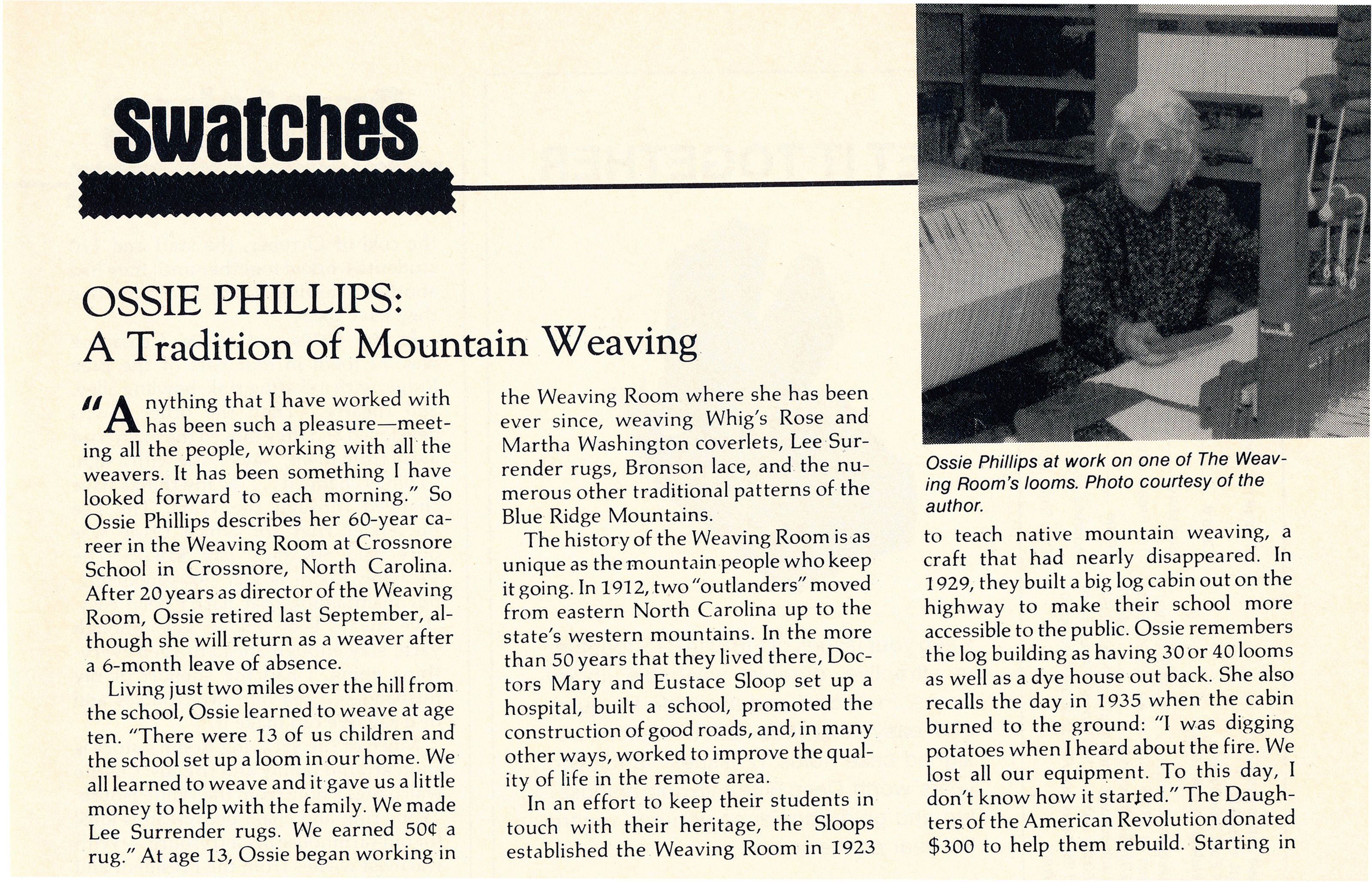 “SWATCHES: Ossie Phillips A Tradition of Mountain Weaving.” Fiber Arts Magazine. 1987 Vol No. 2. https://cynthiamsheward.com/wp-content/uploads/2019/03/ossiephillips_new-2.jpg https://cynthiamsheward.com/wp-content/uploads/2019/03/ossiephillips_0001-4.jpg